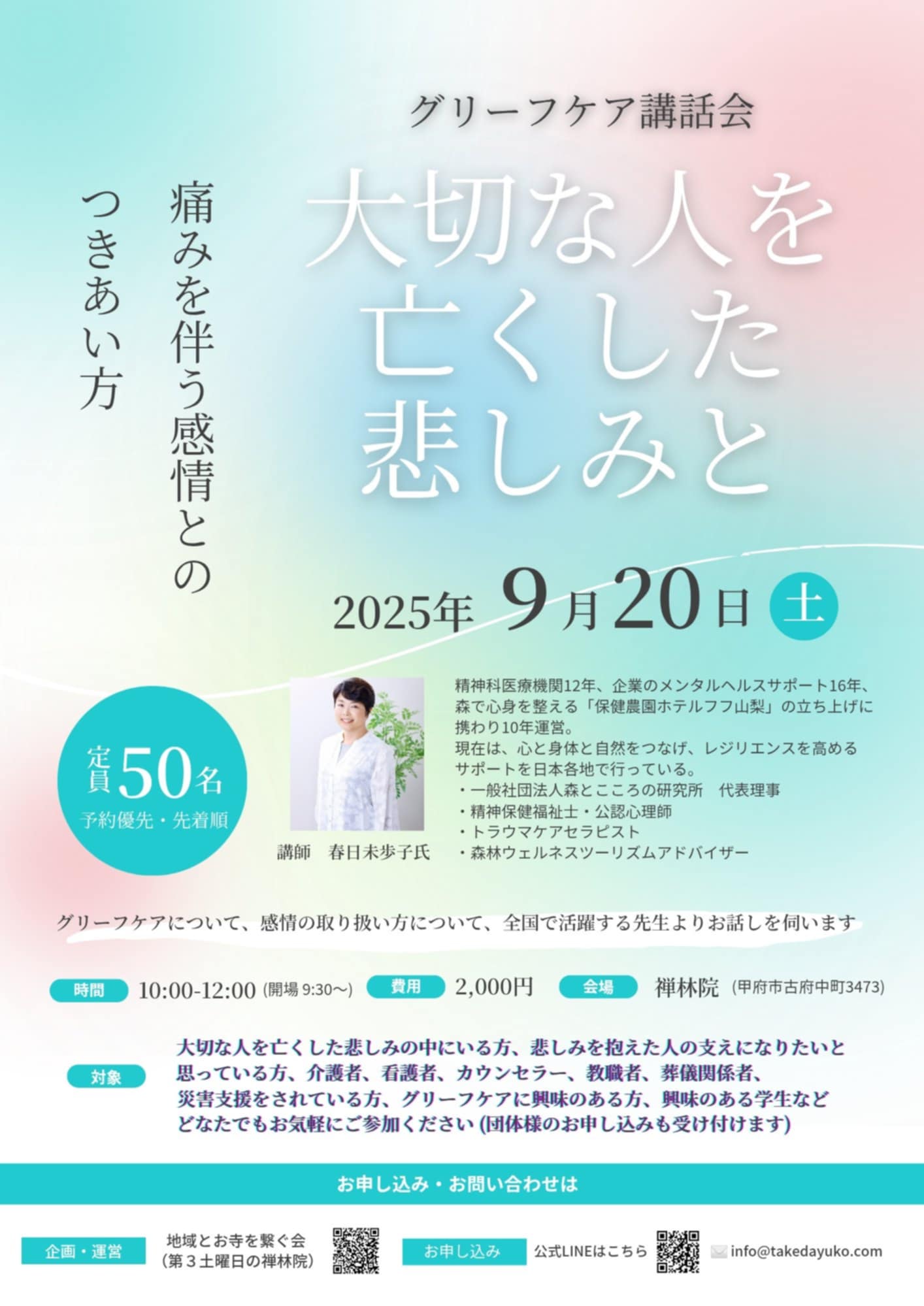 甲府の禅林院で「グリーフケア講和会~痛みを伴う感情とのつきあい方」をお話します